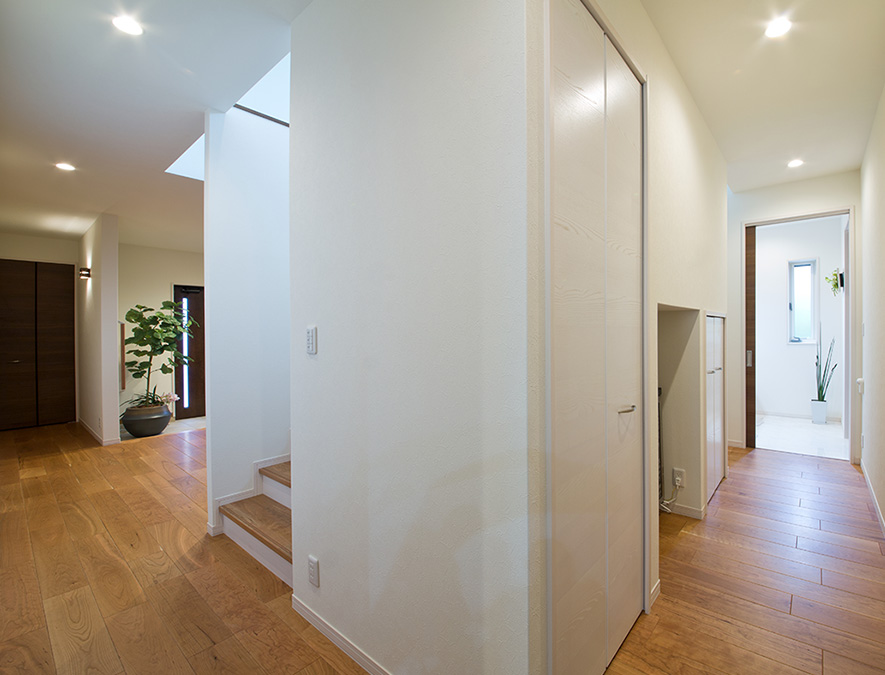 玄関ホールから壁で隠した階段の周りをぐるりと回遊できる動線でLDKと洗面室を行き來しやすくしています