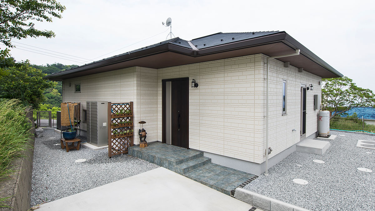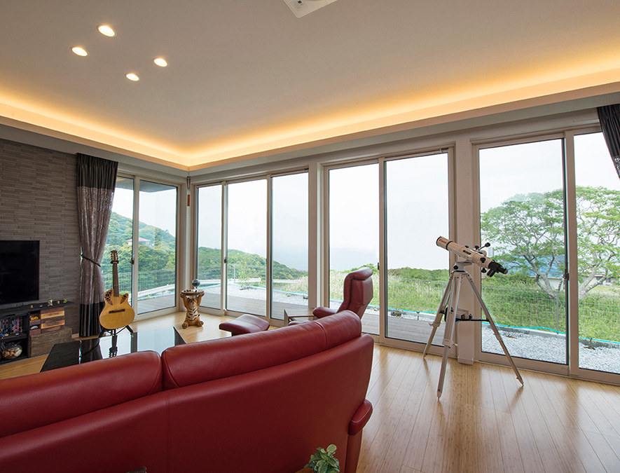 都會の喧噪を離れて心豊かな人生を過ごせる「隠れ家」にしたいと、青い海と富士山の雄姿を望む山間部に平屋の別荘を建てられたMさま。大開口のコーナーサッシからパノラマのように広がる眺望は、まさに憧れていたイメージ通りだったそう。「音楽を聴きながら好きな読書にふけり、夜には満點の星空を観測する楽しみも生まれました」と顔をほころばせるMさまです。