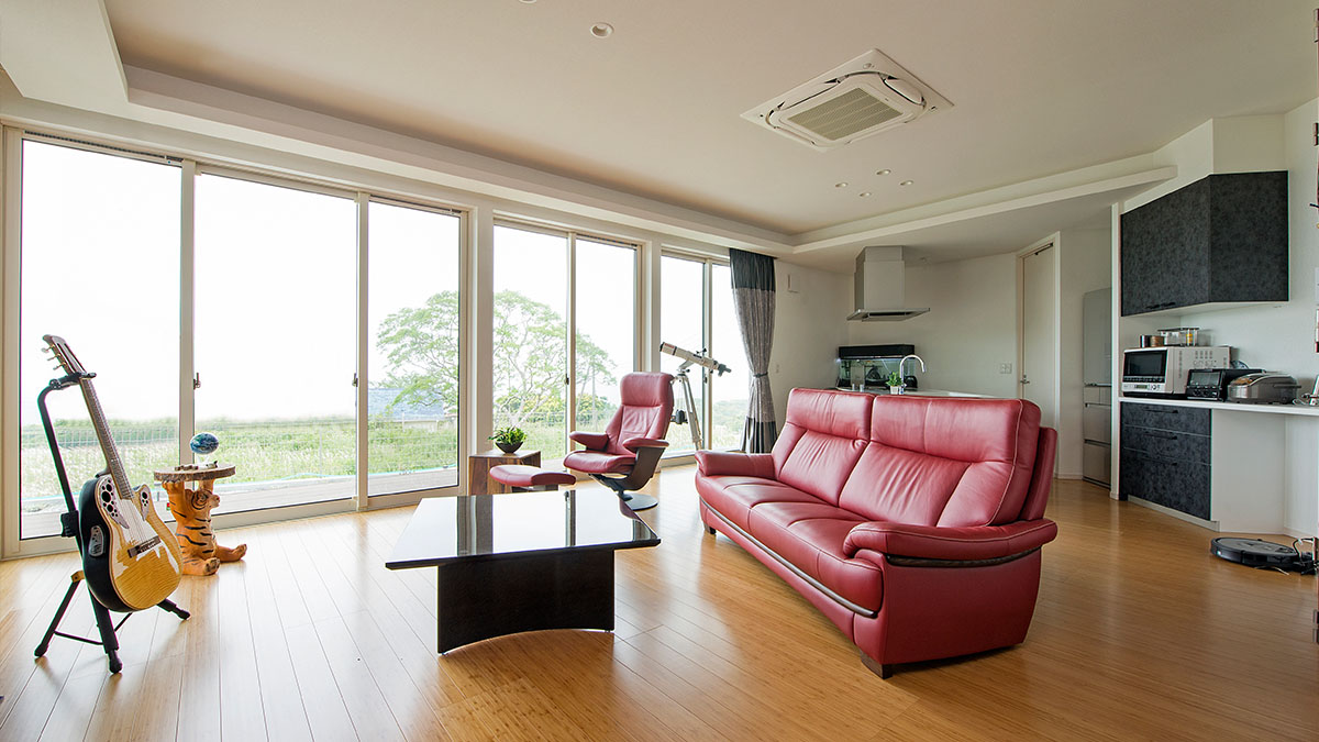 バンブー材の床がリゾート感を生むリビング