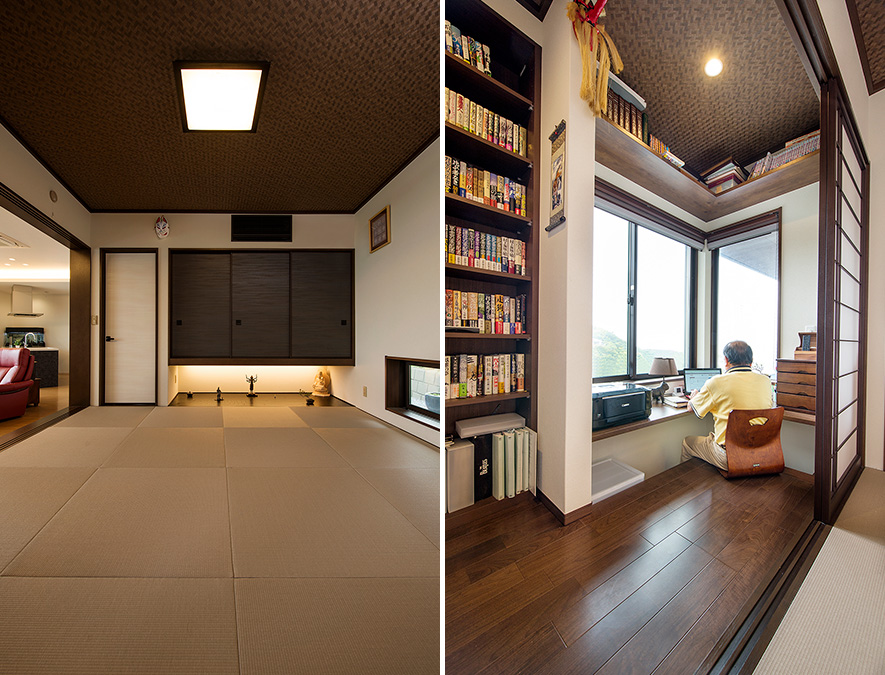 小上がりの和室は網代柄クロスで落ち著きを。吊り押入の下には間接照明を入れ、コレクションの仏像を飾られています。続きに縁側を現代風にアレンジした書斎スペースをしつらえ、本棚や足が下ろせるカウンターを造作。座るとコーナーサッシから山と海が眺められます。