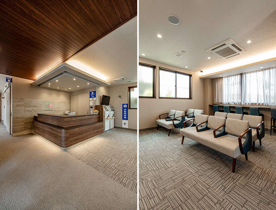 タイルカーペットや板張りの化粧天井が落ち著きを生む受付と待合室。木目調の受付カウンターは、ストーン調タイル壁や間接照明で上質感漂う雰囲気に。待合室は腰窓の前にカフェ風カウンターを造り付け、景色が見られるようにしました。ホテルのラウンジのような空間で、患者様はリラックスして診察を待つことができます。