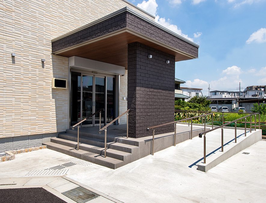 チャコールグレーのタイルを張ったエントランスポーチ。ベージュの外壁と美しいコントラストを描いています。ウッドパネルの天井がアクセントに。車椅子の患者様も來院しやすいよう、手すり付きのスロープも設けています。