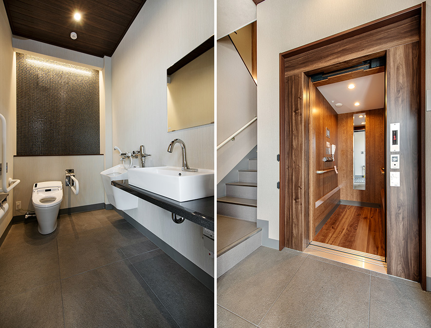 エントランスドアの手前の風除室に設けた車椅子対応のバリアフリートイレ。グレータイルの土間や、間接照明を入れた黒いモザイクタイル壁でシックな雰囲気に。オストメイト対応用の流しも設置しています。1?2階を結ぶエレベーターも木調の內裝で溫もりある雰囲気に。