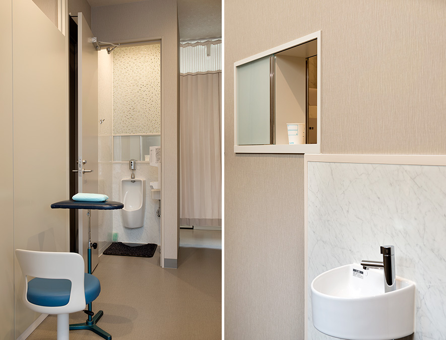 クリニック內のトイレは男女別々の個室にし、男性用には小便器を設置。前の壁に尿カップを置く窓口を設け、バックヤード側から看護師が取り出せるようにしています。看護師は窓口のそばの手洗い臺ですぐに手を洗うことができ、殘尿も流せます。