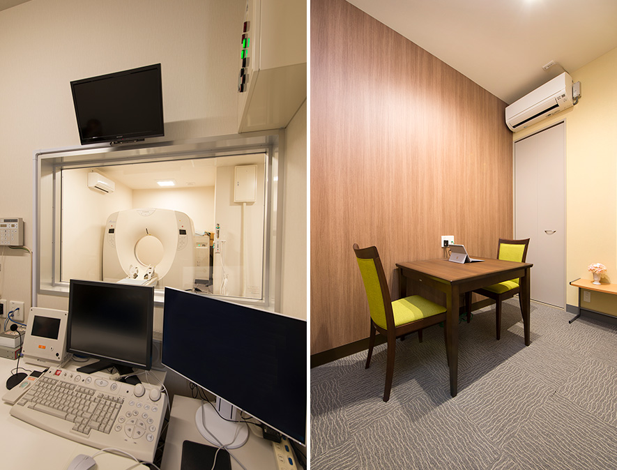 左/CT検査室と操作室。16列マルチスライスCTを導入し、スピード診斷を可能にしました。