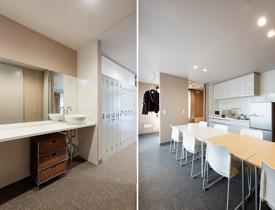 仮眠室やランドリー、パウダールームも備えた快適なスタッフ休憩室
