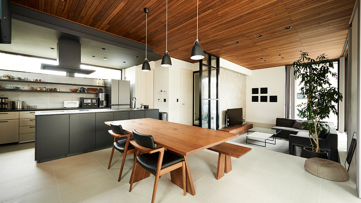 無垢板張り天井が溫もりを漂わせるモノトーンのシックモダンなLDK