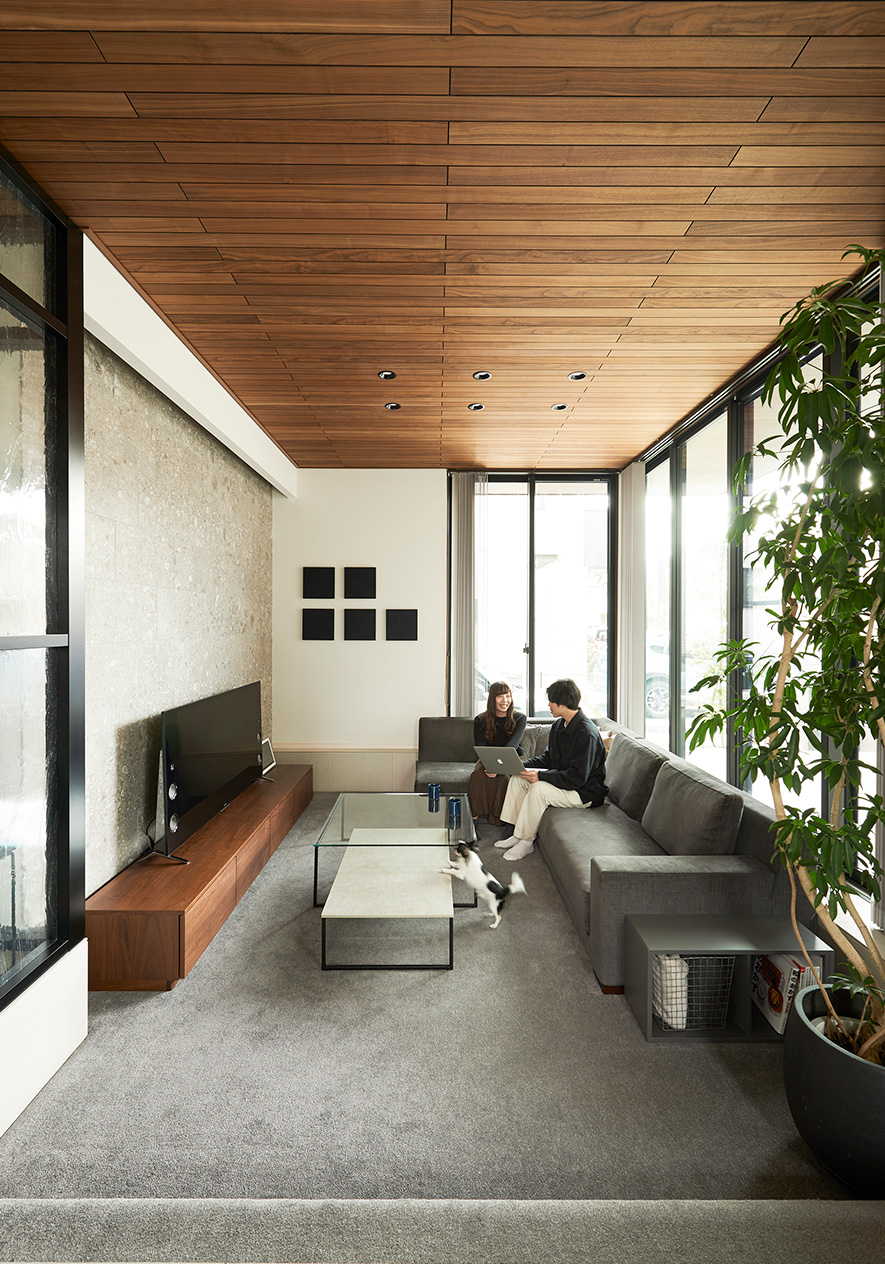 ロースタイルリビングはカーペット貼りにしてくつろぎ感ある雰囲気に。天井まで窓にした“グランフルサッシ”が連続し、ひときわの開放感を生み出しています。「床が一段下がっているから、ソファを置いても窓がふさがれず、圧迫感がありません。3mを超える天井の高さや視界の広がりが気持ちいいですね」とKさま。