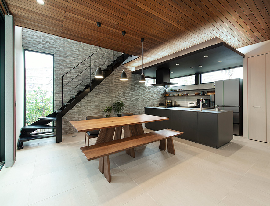 「白」のタイル床に「黒」のアイアン階段やアイランドキッチンがスタイリッシュに映えるダイニングキッチン。キッチン背面のハイサイドライトからも光がやさしく差し込みます。石貼り壁の隅に配した縦型の窓は遊歩道の桜を眺めるピクチャーウインドウ。「春は食事をしながらお花見をするのが楽しみですね」とKさま。
