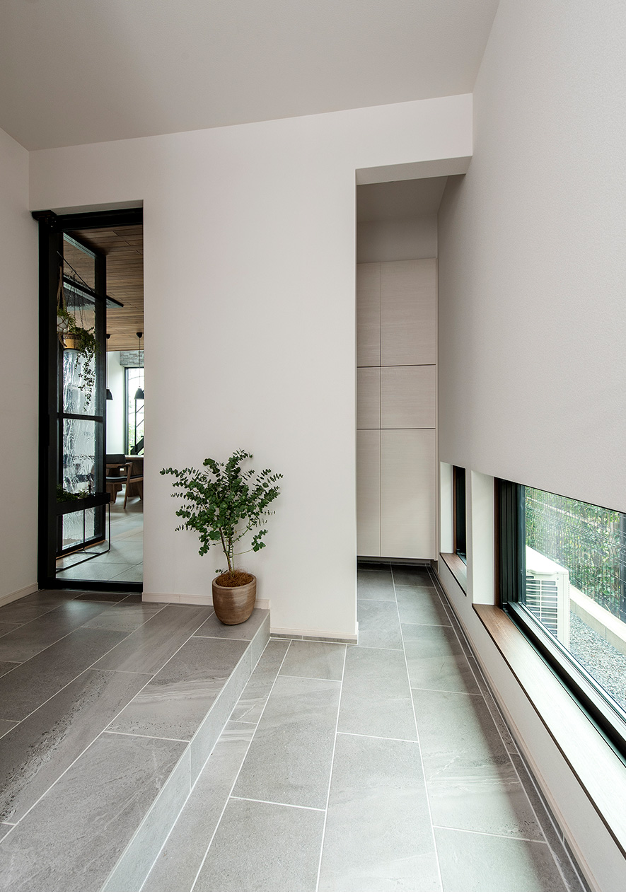 土間からホールまで同じグレーのタイル床で仕上げてすっきりと見せた玄関ホール。地窓を切って外からの視線を遮りつつ、光と景色を採り入れています。仕切り壁の後ろはシューズクローゼットを備えた家族用玄関で、LDKヘと直接つながる動線になっています。