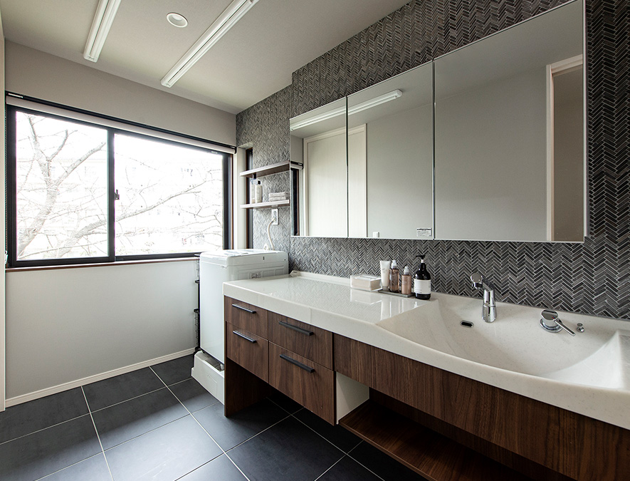 ヘリンボーン貼りのタイル壁が映える洗面室