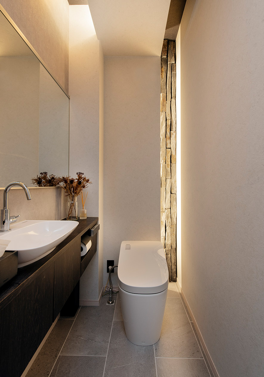 巖を割ったような荒々しい天然石張りの縦壁が印象的なトイレ。石張り壁の裏側や下がり天井に組み込んだ間接照明の光が空間を美しく彩ります。「訪れた人の誰もがこの演出に感嘆してくれます」とKさま。