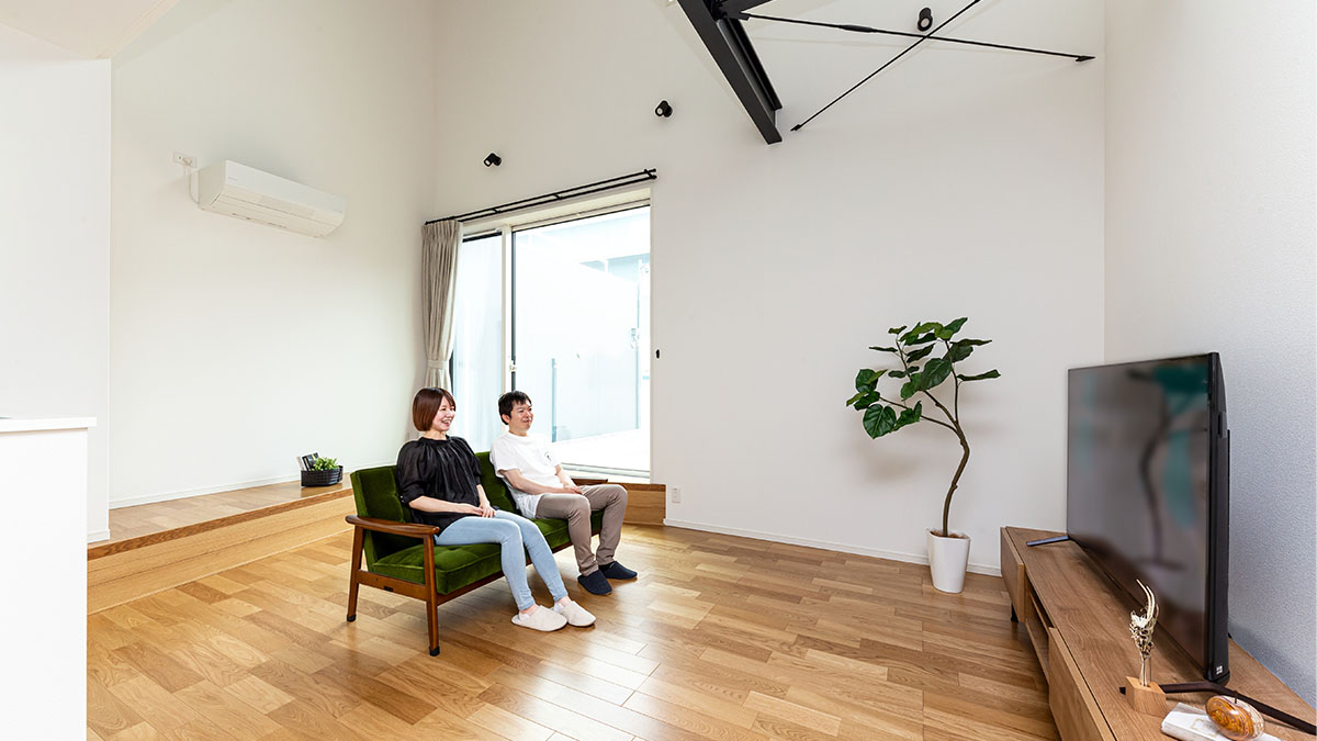 南側全面を吹き抜けにしたリビングで庭の緑や空の移ろいを眺め、光に満ちた開放感あふれる暮らしを楽しむIさまご夫妻。無駄な裝飾を削ぎ落とし、木目の天井や黒の梁をアクセントに生かしたシンプルなインテリアは、ミニマムな生活を好むお二人のライフスタイルにもぴったりマッチ。「こんな大きな吹き抜けがあるのに夏は省エネ冷房で涼しく、冬は床暖房だけで十分暖かく過ごせます」と快適な住み心地にも満足されています。