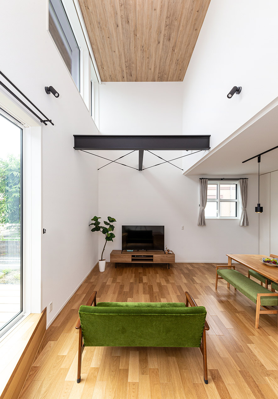 黒く塗った現し梁(あらわしばり)をインテリアに生かした吹き抜けのリビング。木目の天井が溫もりを生み、大切にされているグリーンのソファがバランスよく調和しています。「家にこもっていても伸びやかで開放感のある暮らしができるのがうれしくて。吹き抜けの高い窓から空が見えて気持ちがいいですね」とIさま。