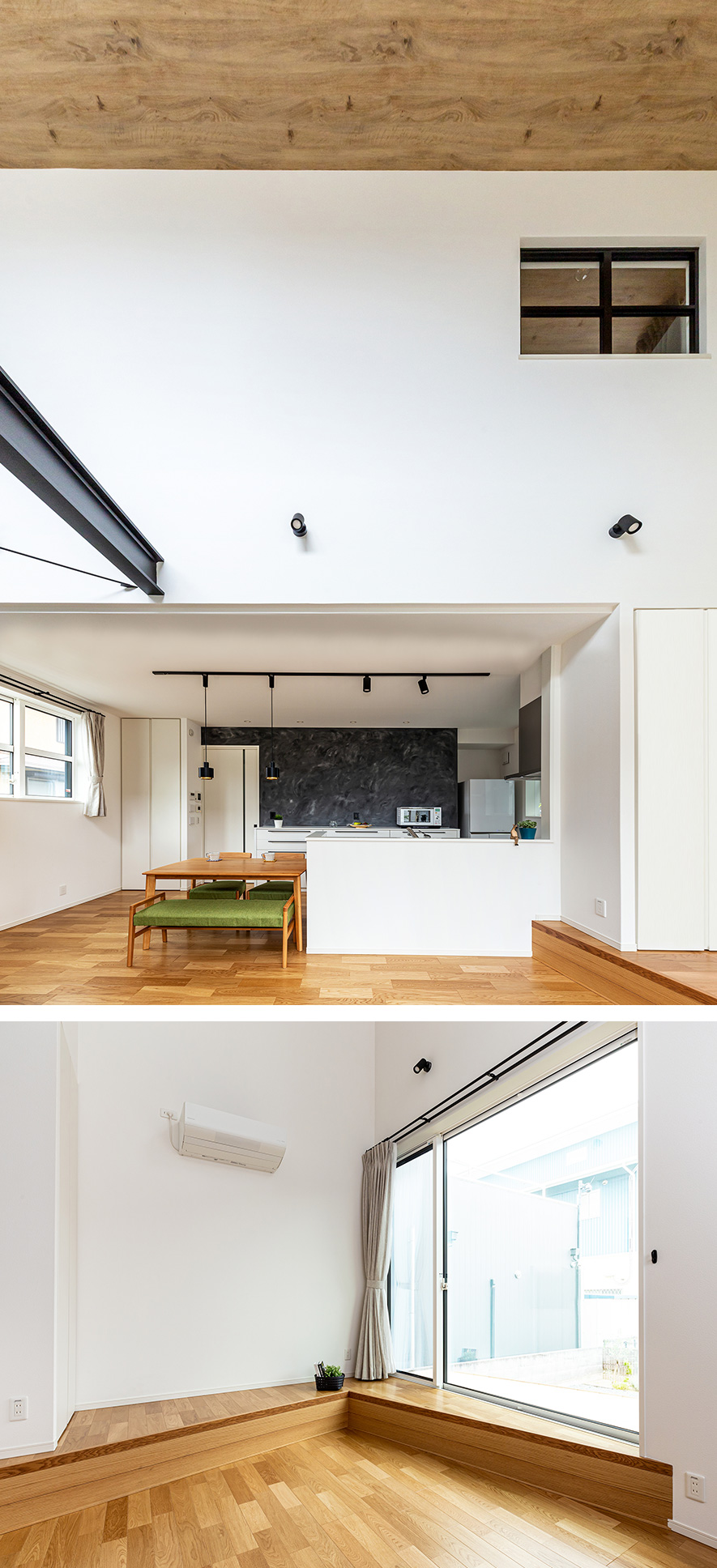天井の高低差で豊かな表情を生み出したLDK。キッチン背面の墨を溶かしたような壁が、シンプルなインテリア空間のアクセントに。リビングには斜めデザインのベンチを配し、ウッドデッキと高さを揃えて內と外を一體につなげています。ベンチに座ると視線の変化が楽しめて、庭の眺めが自然に目に入ります。