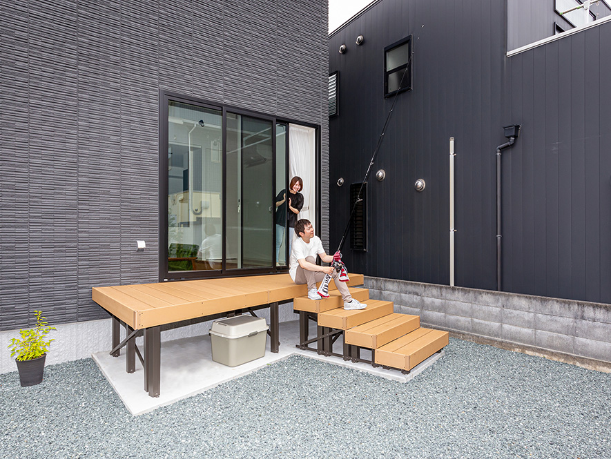 リビングからつながる庭のウッドデッキは自然を感じる憩いのスペース?!袱长长贤イ尉vとふれあって気分転換できる場所。日向ぼっこをしたり、お茶を飲んだり、友人を招いてバーベキューも楽しんでいます」と笑顔のご夫妻。海釣りが趣味のIさまは、釣り竿のお手入れにも活用されています。