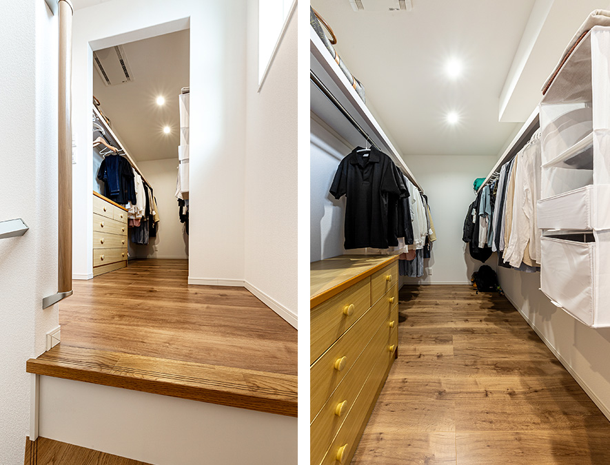 ウォークインクローゼットは階段を上がってすぐ正面に設けることで、1階からも2階の寢室からもアクセスしやすい便利な生活動線に。あえて扉をつけず、オープンな開口にして出入りをスムーズにしています。両サイドにハンガーパイプと棚を設置し、引き出しタンスもすっきりと収めました。
