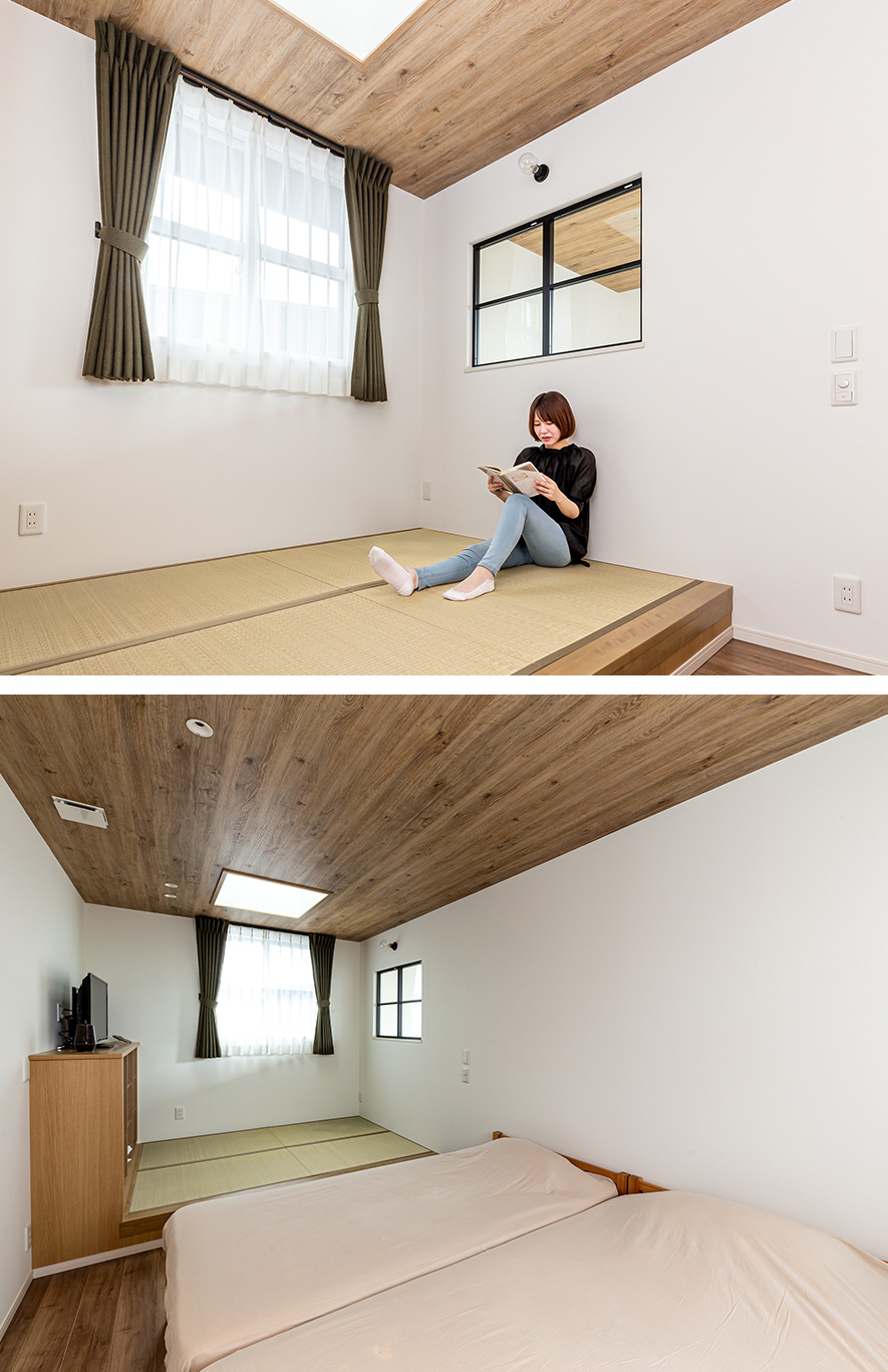 寢室の一部にしつらえた小上がりの畳スペースで、トップライトから差し込む光のもと、読書にふけるIさま。クロスバーウインドウ越しに吹き抜けのリビングと視線がつながる楽しさもお気に入りです。寢室も木目の天井で安らぐ雰囲気に。「ぐっすりと安眠できるので、朝は早起きできるようになりました」とIさま。