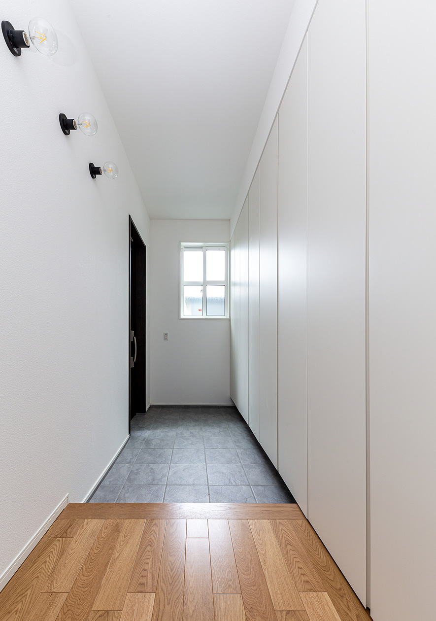 クロスバーウインドウから光が明るく差し込む玄関ホール。土間からホールまで壁一面を覆う収納を表面に取っ手のない白の扉で統一して壁のように仕上げ、天井も照明をつけずにすっきりと見せたシンプルなインテリアの美しいこと。釣り道具やスーツケースなどかさばるモノもここに収納しています。