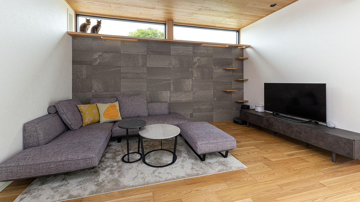 愛貓に対するご夫妻の思いを伺い、しっかりとご要望を把握した上で、ご家族の一員である大切な愛貓と楽しく快適に暮らせるプランを考えました。リビングのソファに座ったときも、キッチンに立ったときも、視線の先に見える愛貓の姿や外の風景を意識して設計しています。愛貓がリビングから階段室へと通り抜けて自由に移動できるキャットウォーク動線もお気に召していただけました。