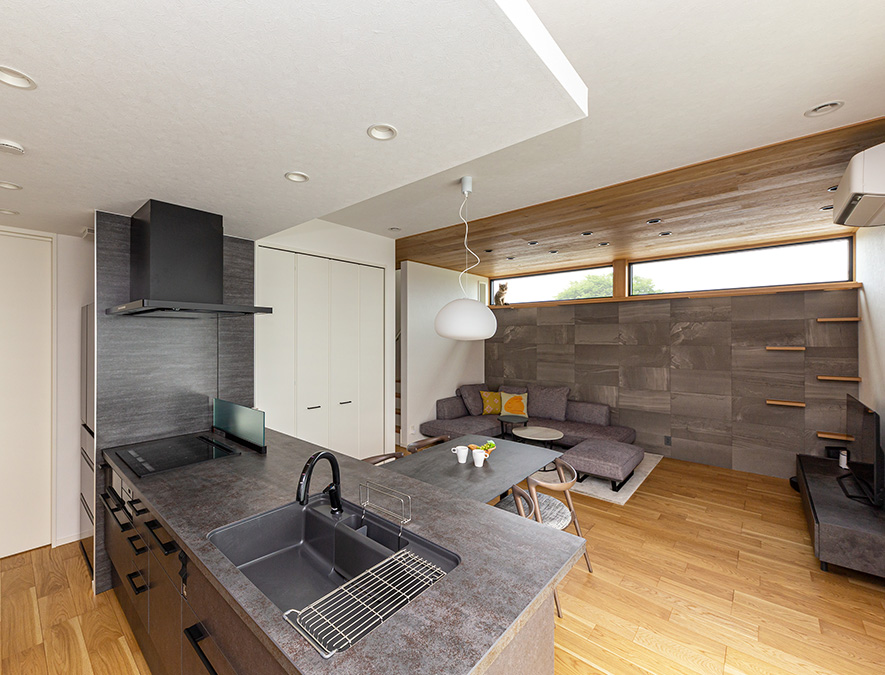 アクセント壁と一體化したキャットウォークが楽しいリビング。愛貓はキャットウォークに乗って高い窓から外を眺めるのが大好きだそう。橫長の窓で美しく切り取られた景色がキッチンからも楽しめます。