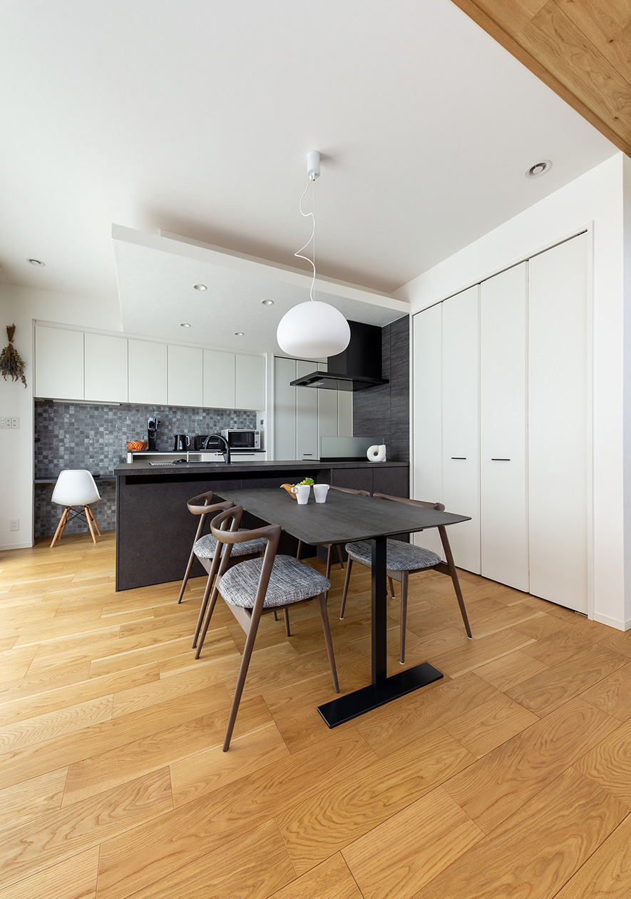 白×グレー×黒ですっきりと統一されたダイニングキッチン