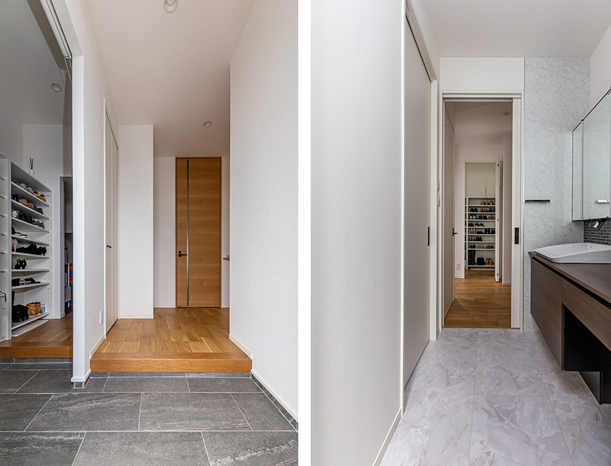 天井まで屆くリビングドアがスタイリッシュな玄関ホール。シューズクロークを家族用の脇玄関に。シューズクロークの突き當りは階段下収納になっています。ホールを右手に行くと洗面室に直接つながり、帰宅後の手洗いや著替えもスムーズです。