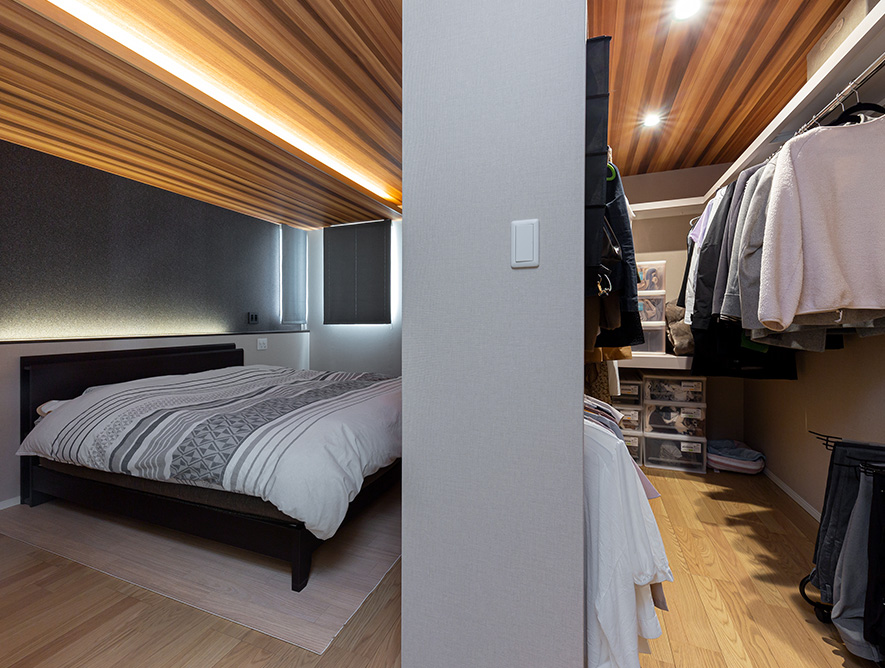 素材感のある黒のアクセント壁を間接照明で彩り、天井を一段下げることでやすらぎ感漂う雰囲気に。寢室內にオープンスタイルのウォークインクローゼットも設けて、衣類をすっきりと収納しています。