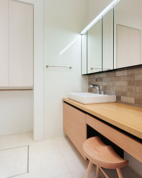 ホワイトをベースとした空間に、木とタイルによる素材の変化で存在感が際立つ洗面化粧臺。ゆったりとした幅のあるカウンターにはスツールを置いて、身支度や軽い作業(yè)ができるようにしています。