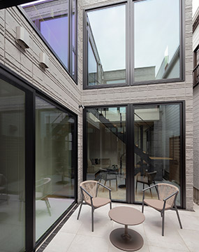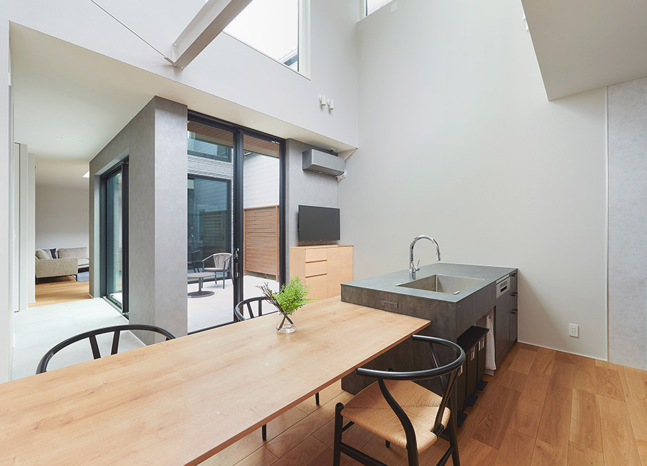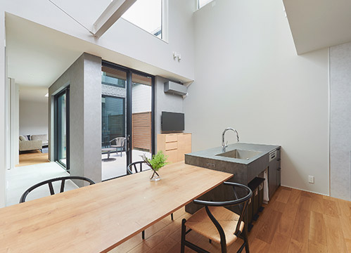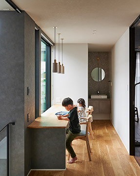 外に開くのが難しい敷地環(huán)境でも、中庭を活かすことで明るく心地よい空間は実現(xiàn)できます。中庭まわりに吹き抜けや階段を設けることで、上下に開放感のあるプランニングとしました。リビングとダイニングキッチンは、中庭を介して視線が通ることで、外も含めて一體感が得られます。生活効率を高める?yún)Ъ{を適所に配し、空間に馴染む仕様にすることで洗練された印象が保てます。お子さまへの配慮もあり、溫もりを感じられる素敵な家が完成しました。