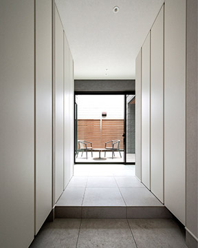 玄関から中庭まで連続するタイル床が外との連続感を高め、通り土間の趣を加えています。両側(cè)に配した収納はベビーカーなど大型の物が入る?yún)Ъ{力を持ちながら、取っ手をなくし、すっきりと見せた扉を連ねることで、中庭への視線を遮らないよう配慮しています。