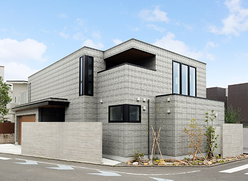 グレーの外壁とブラックの窓まわりで重厚感のあるフラット屋根の外観。プライバシーへの配慮から大きな開口は設けず、コーナー窓やインナーバルコニーによって効果的に視線の抜けをつくっています。玄関ドア前には門壁を設け、道路からの視線に配慮しています。