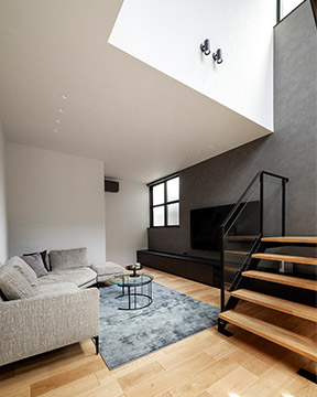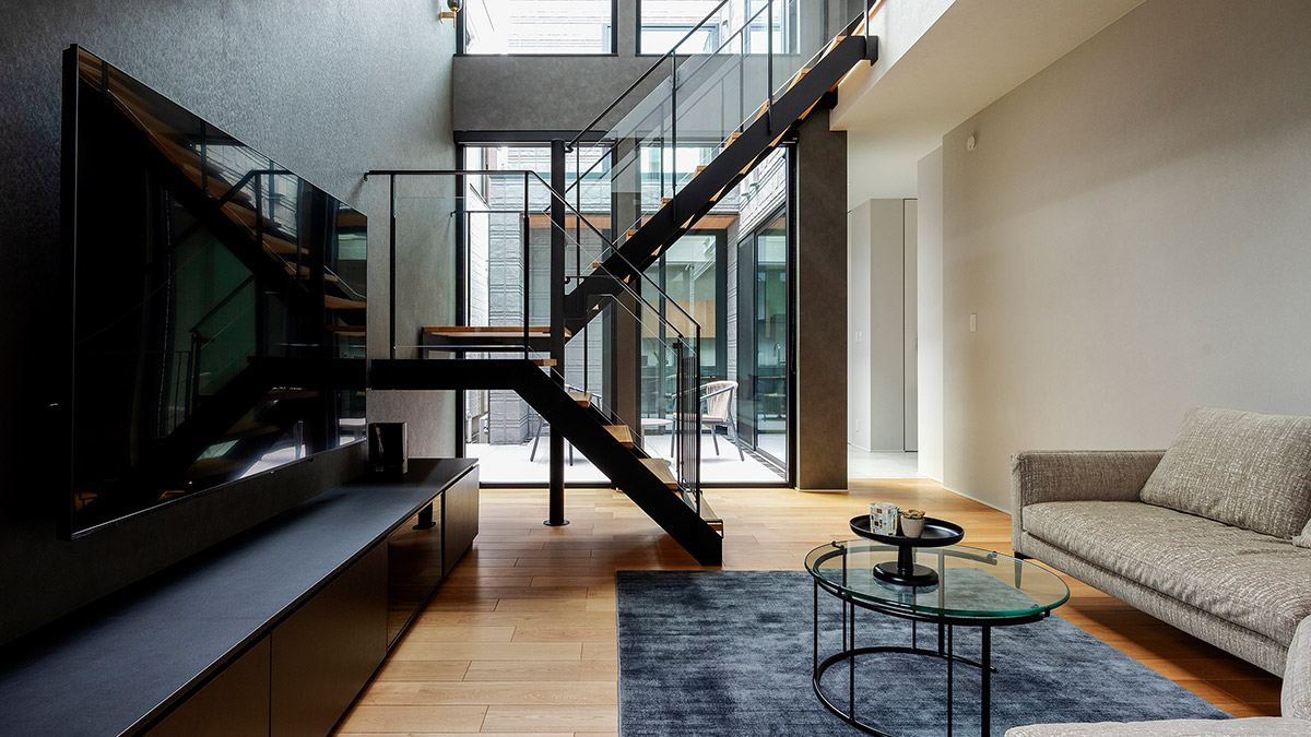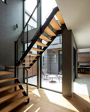中庭からの光を全面に受ける明るいリビング階段。階段手摺や窓まわりはブラックやダークグレーの色味で合わせ、一體感を持たせています。スケルトン階段とすることでリビングへの採光を妨げず、外と內(nèi)の境界を昇るような開放感です。