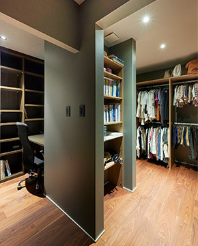 ダークグレー壁が寢室とつながる書斎スペースと大型収納