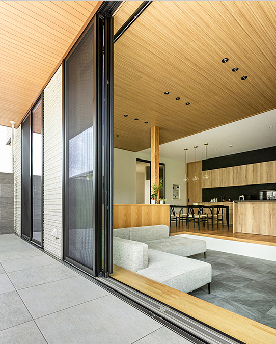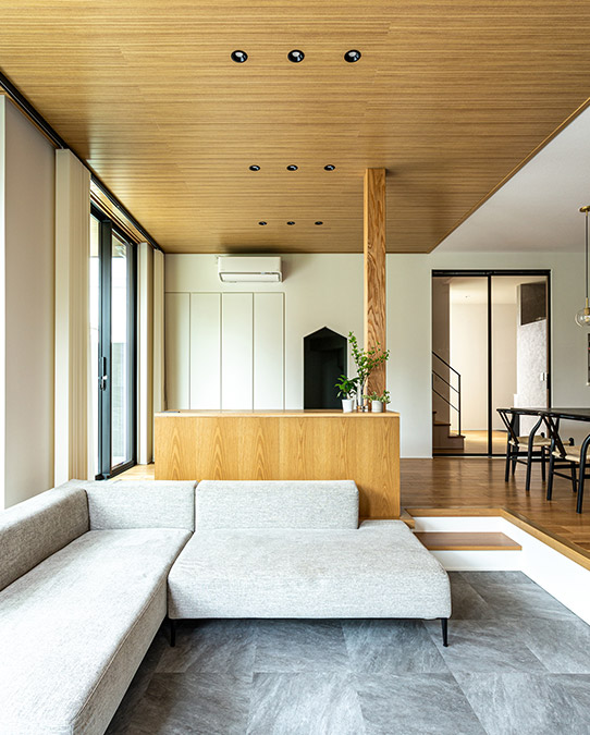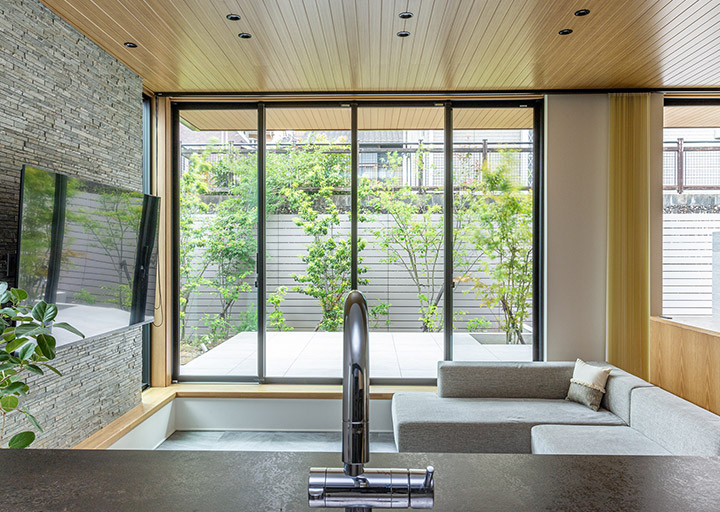 家の隨所で絵になる風景が視界に入り、つい足を止めて佇みたくなるKさまのご新居。他のスペースと動線を共有しないことで落ち著きを重視したLDKは、L字に配置された大開口から色彩豊かな庭に視界が広がります。外の軒天にデザインを連続させた、木張り天井のロースタイルリビングでは、さらにプライベート感のあるくつろぎが感じられ、目の前に広がる風景に沒頭する贅沢な時間が得られます。美しく手入れされた庭は計算された窓によって効果的に室內に取り込まれ、なにげない生活のワンシーンを彩ります。