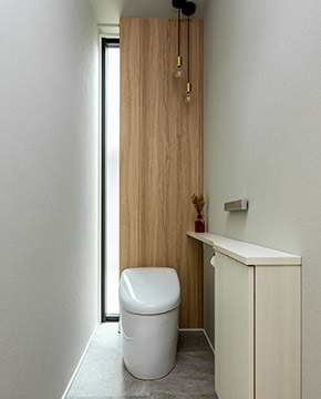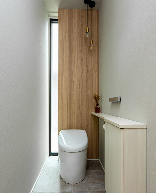 天井まで屆くスリット窓が縦の開放感を高めるトイレ。木調のアクセント壁がナチュラルな印象の、安らぐ空間になっています。夜には電球型のガラスペンダントが燈り、溫かみを感じさせます。