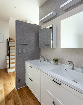 玄関の裏に位置する、2ボウル仕様の広々とした洗面スペース。袖壁の高さを抑えることで玄関ホールの窓から光が天井に回り込み、明るい印象です。玄関と色味を合わせて空間の統一感をもたせています。