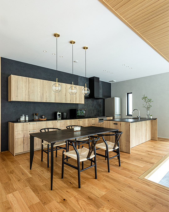 木調色とブラックのカラーコーディネートでメリハリをつけたダイニングキッチン。キッチンのワークトップとダイニングテーブルは同素材のもので一體感をもたせ、広々としたキッチン空間を演出しています。真鍮とクリアガラスのペンダント照明がアクセントになっています。