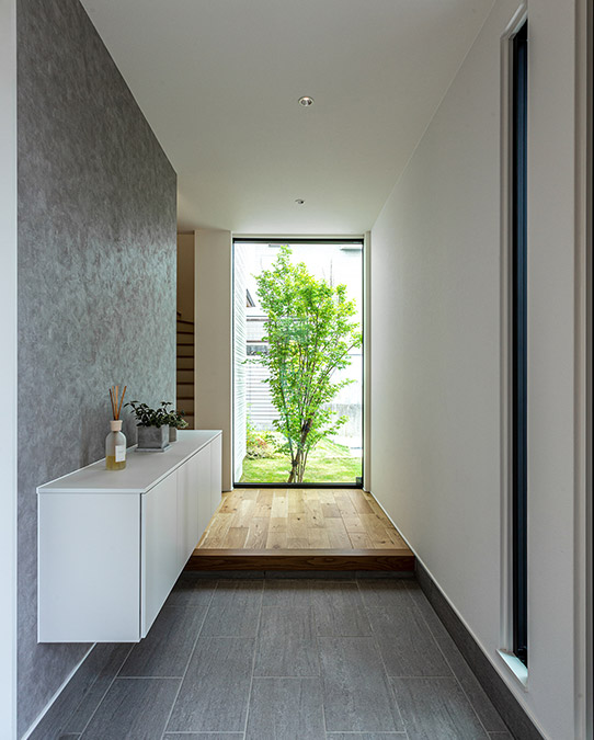 玄関を入るとピクチャーウインドウから色鮮やかなイロハモミジが視界に飛び込み、季節の移ろいを感じられます。玄関はグレーとホワイトで極力シンプルに。照明の人感センサーはシューズボックス下部に、スイッチ類は玄関の裏側に設置しています。室內をすっきりさせることで、窓の外に視線が向くよう設計されています。