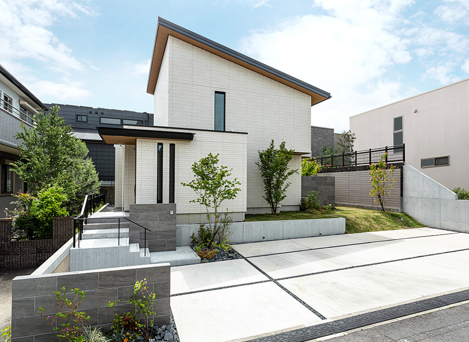 片流れ屋根がおおらかに架かる外観に、植栽の彩りを