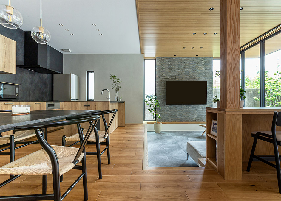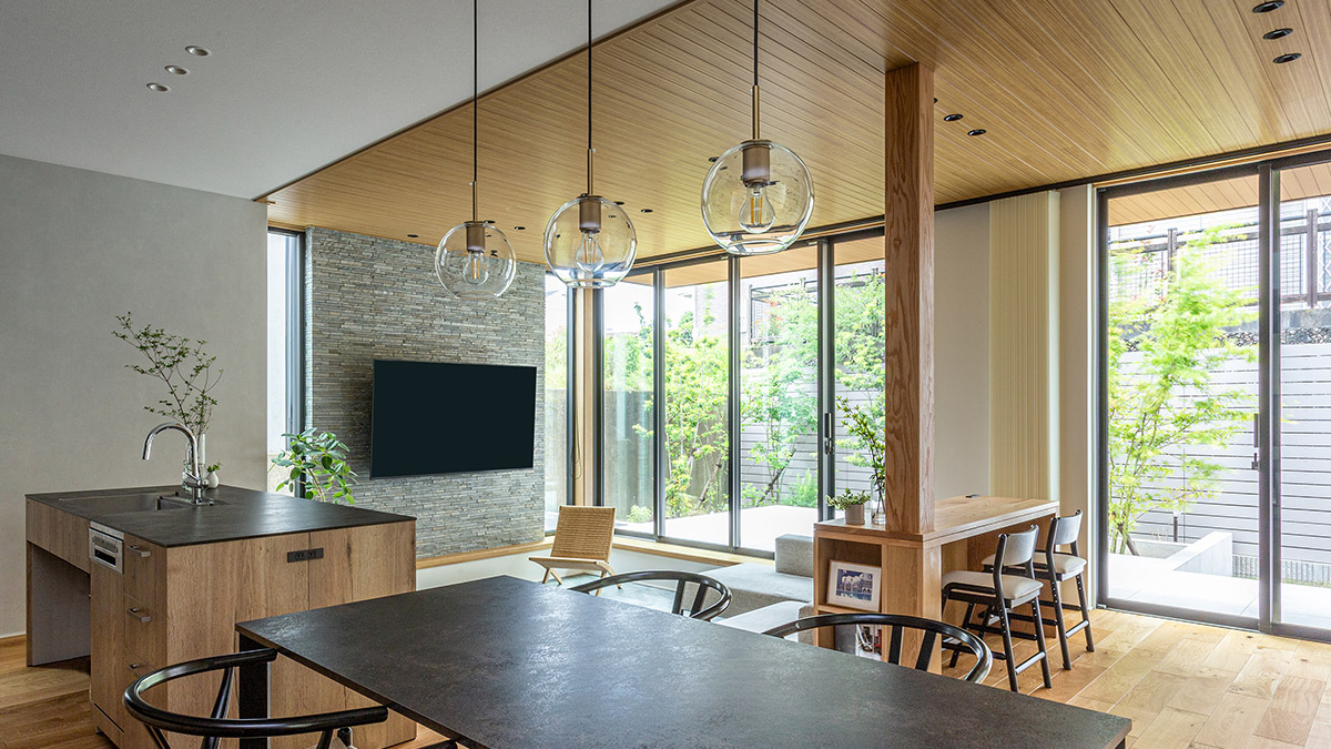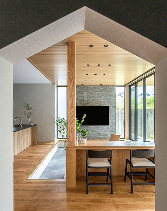 緑が豊かな庭に視界が広がるLDK。L字に配置された大開口から、木張りの天井を軒まで連続させることで內外の一體感が得られます。天然石張りの壁は、両側の開口から視線を抜くことで存在が強調され重厚感を高めます。柱と一體的に造られたデスクは家の特等席。四季折々の風景を眺めながら、テレワークも気分が高まるそうです。
