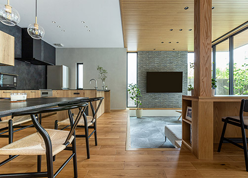 LDKは天井高を確保しながら空間に変化をつけるため、ロースタイルリビングを採用しました。室內からの眺めにこだわったテラスは、季節ごとの風景を楽しめるように樹種を選定しています。美しく風景を取り込むために、窓まわりの仕様や照明など、こだわりがたくさんありましたが、スタッフの皆さんがイメージを理解してくださり、相談を重ねることで完成度の高い家ができました。子どもの頃から家に憧れがあったので、自邸が形になっていく過程は幸せな時間でした。