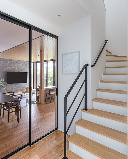 階段前の空間は、ガラスの引き違い戸からLDKへ視界が広がり開放的です。スモークガラスで向こう側の色味が抑えられ、戸を開けた時に大開口から見える緑がより一層鮮やかに感じられます。「スモークガラスにしたことで、透明ガラスよりも子どもたちの衝突防止にもなっているようです」とKさま。