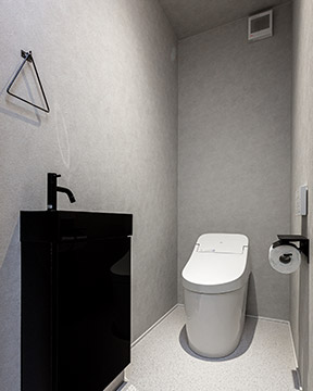 無駄な要素を排除したモノトーンのトイレ。手洗いと収納はブラックで統一しシルエットを際立たせることで、余計な線が目立ちません。直線的なデザインのアクセサリー類がシャープな印象です。