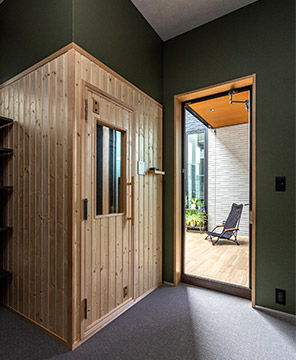 脫衣スペースの一角に設けられたプライベートサウナ。浴室、サウナ、テラスを行き來するサウナ動線は、一直線上につながります。「サウナは個々に集中して楽しみたいので、生活動線と重ならないように配置しました」とSさま。モスグリーンの壁が暗く抑えた落ち著きをもたらし、特別感を演出します。