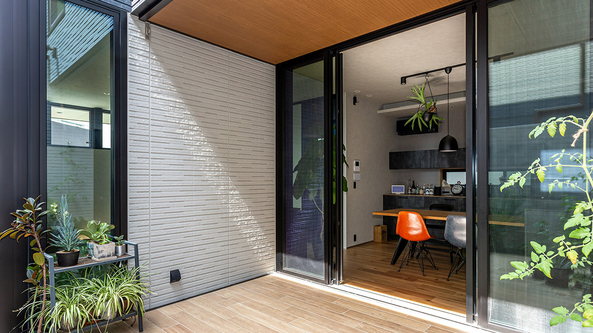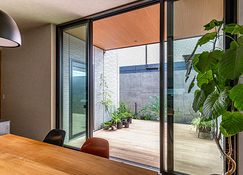 ダイニングキッチンと床がフラットにつながる中庭テラスは、外部からの視線が気にならないプライベートな空間。ダイニングの延長として食事をしたり、くつろいだり、グリーンを愉しんだりなど多用途に使えます。カーテンを設けない大開口から、光の移ろいをダイレクトに感じられるそうです。