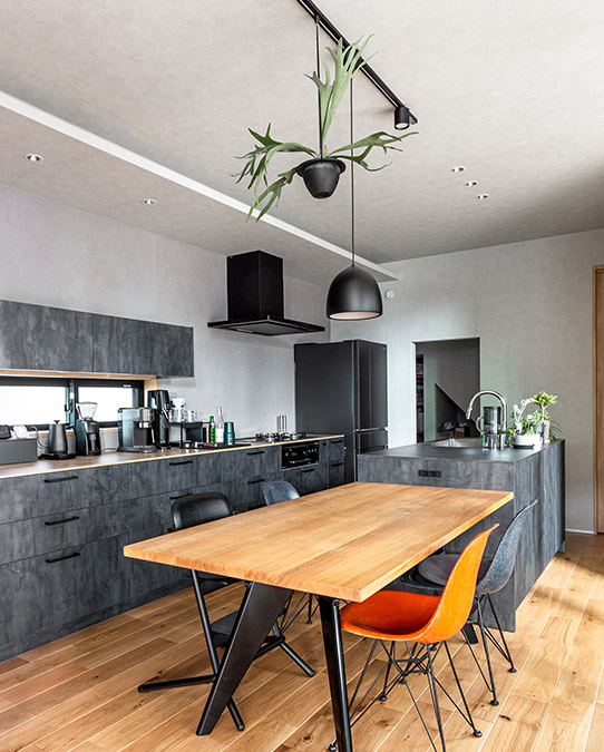 グレーやブラックとオーク材をコーディネートした空間に、質感高いキッチン面材やビンテージチェアが個性を加えています。壁全體にグレーを採用し明度を抑えることで、內外のグリーンが鮮やかに引き立ちます。折下げ天井を利用した間接照明やグレアレスダウンライトによって、雰囲気を高める照明計畫です。