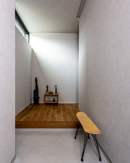 シンプルにまとめたグレーの玄関に、天然木の床材やモルタル敷きの土間が表情を加えています。照明器具やスイッチ類を露出しないノイズレスな空間とすることで、ハイサイド窓から差し込む光が美しく引き立っています。