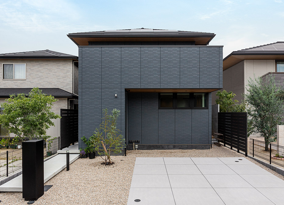 深いネイビーを単色張りした外壁の面積を大きく取り、外からは室內の雰囲気が想像できない外観です。2階には掃き出し窓が並びますが、バルコニーの腰壁をハイウォール仕様とすることで、光は取り込みながら外観には露出しないようにしています。さらに屋根とバルコニーの間にスリット狀の深い奧行が生まれ、外観の陰影を作っています。