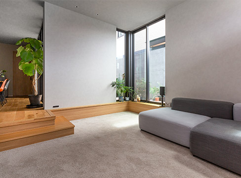 ダイニングキッチンとリビングは、床に段差を設け、床材を変えることでゆるやかに空間を仕切っています。リビングはカーペット敷きとし、深く腰を下ろし安らぐ場所。低いソファは足を伸ばして座ったり、床に座って背もたれにしたり、思い思いのくつろぎをかなえます。